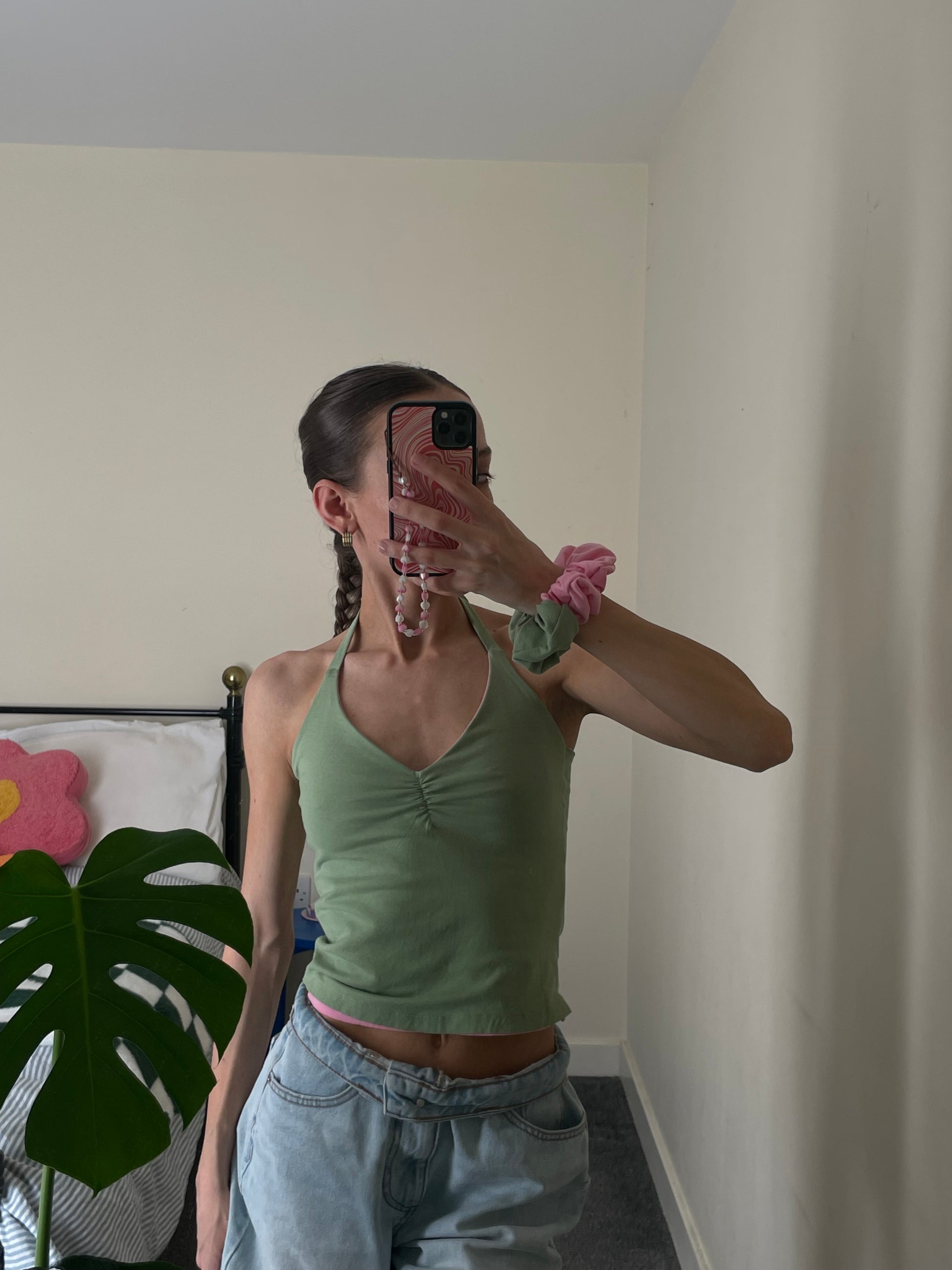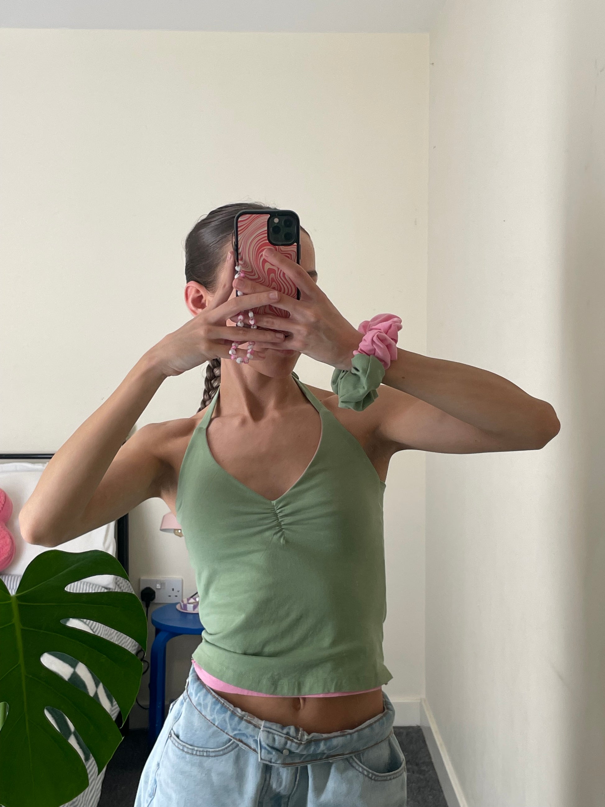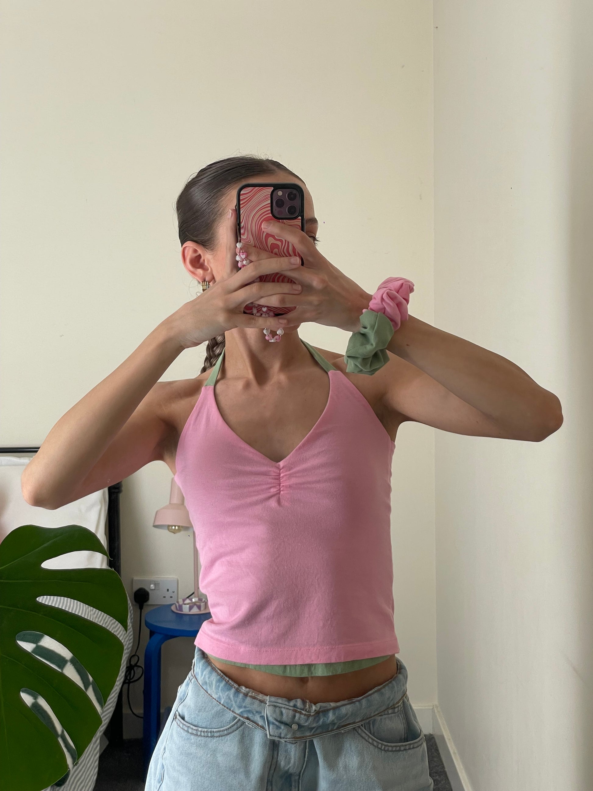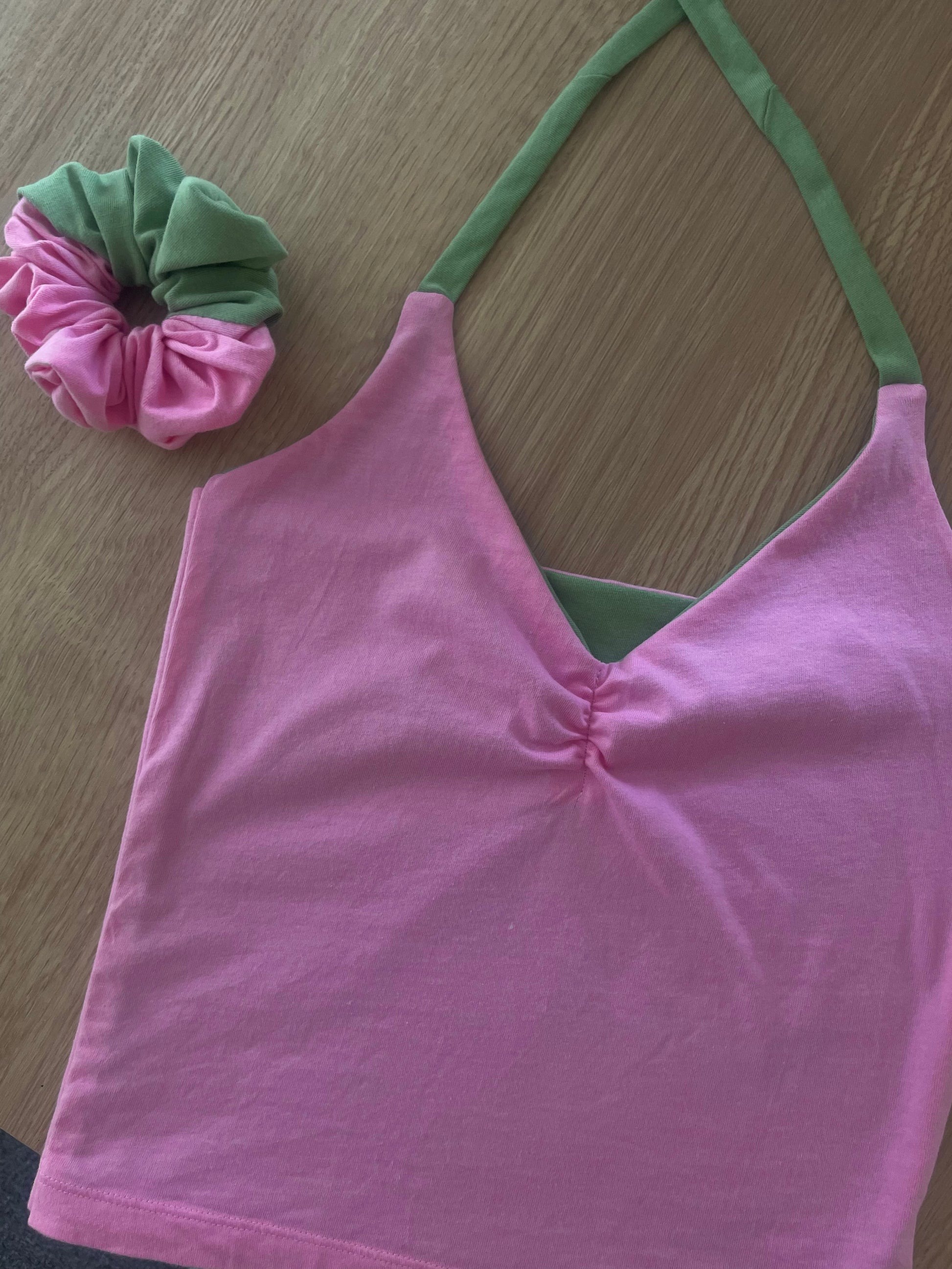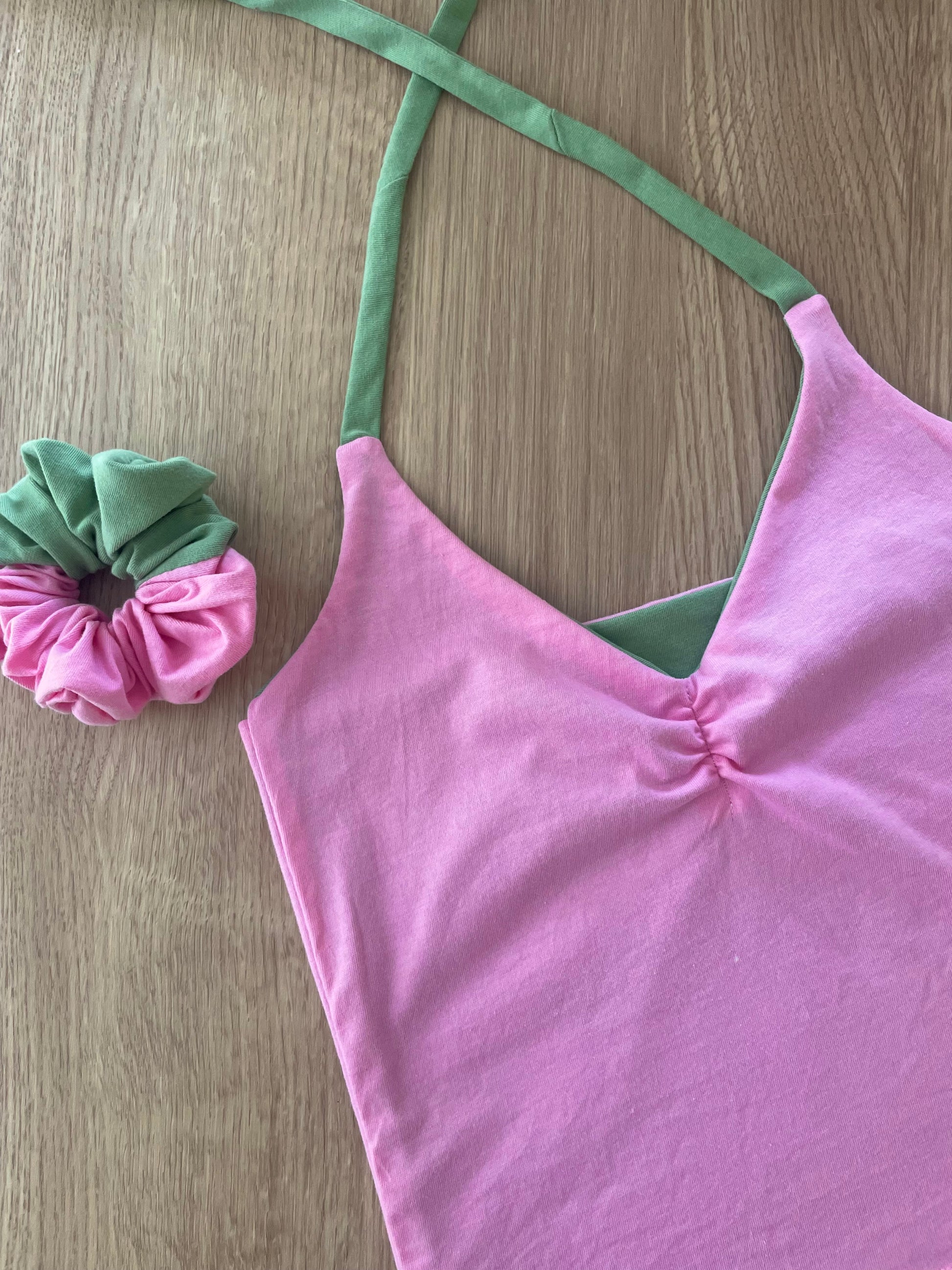 The Anais reversible top - made entirely from upcycling materials - features a soft sage green side and a cute baby pink on the reverse. This top also has comfortable halterneck straps and the cutest matching scrunchie! This fabric is extremely soft and has a lot of stretch ensuring a comfortable fit and moulds beautifully to your figure. Lining on the inside means no need for worrying about this top being see through and also means the added benefit of it being a super durable, good quality garment that will last in your wardrobe.
